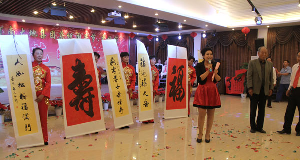 晚会在婀娜多姿,喜气洋洋的开场长绸扇舞《欢天喜地》中揭开序幕。“我和我的祖国一刻也不能分割,无论我走到哪里……”来自中控室的王亚旭、郭慧娟合唱的《我和我的祖国》,声情并茂,催人奋进,在现场产生强烈共鸣,博得一阵阵热烈的掌声。《夫妻双双把家还》来自星空豫音社的单保民袁素玲,唱出美好生活的韵味,给人一种清新的感觉。更让人难忘的是台胞芮文正老先生也来到我们的晚会现场,亲自执笔,现场书法,并赋诗词,赠福赠寿,给大家带来了无限的惊喜与欢乐……。这是一个激情奔放的夜晚,这是一个魅力四射的大地之夜!大地集团这支充满活力的朝阳团队,必将开创中国水泥行业的新天地。