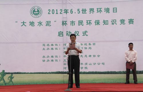 大地集团办公室主任闫中安代表企业发表了“倡导绿色消费  保护生态环境”的倡议书,呼吁广大市民提倡“绿色消费”的生产和生活方式,争做“绿色消费”的发动者和实施者……。并宣布20126.5世界环境日“大地水泥”杯市民环保知识竞赛启动仪式正式开始。