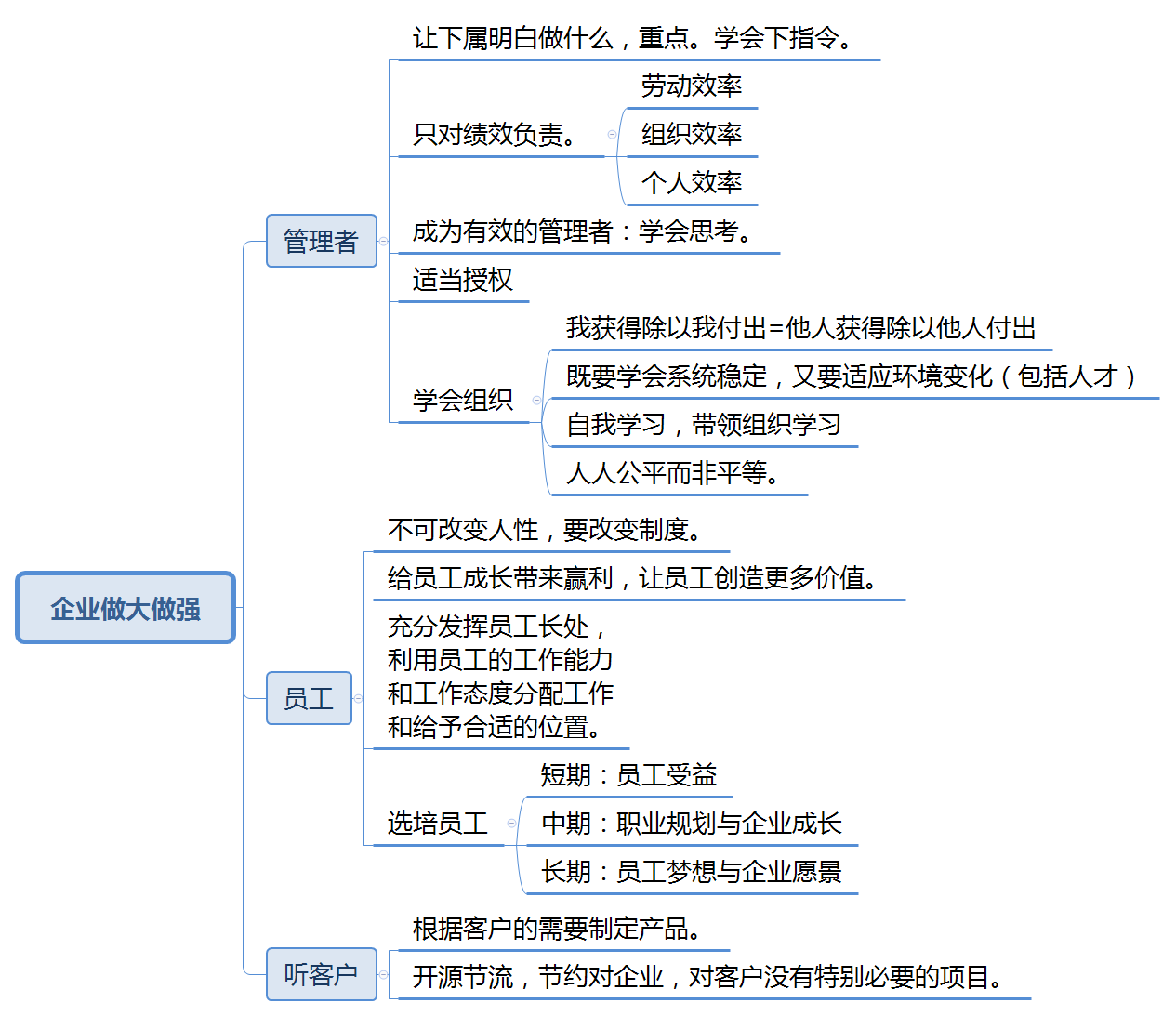 为期5天的中旭培训学习结束了,非常感谢公司对我的信任,为我提供了这次宝贵的学习机会。管理者的五项修炼,使我收获很大,自己对管理这件事和管理者资格角色都有了更深刻的认识,这些知识对于今后的工作有很大的帮助和提升。 管理者的五项修炼,从基层,中层到高层管理者,全面的讲解了什么是管理者,如何成为一名合格的优秀的管理者。不仅使我对当下的工作有了新的认识,也对未来的的工作有了更明确的方向。同时,对集团的很多决策有了深入的理解,对企业文化也有了新的认知,加深了对企业的认同感。 以下是这5天培训的一些心得体会: 一、管理者与管理的目的 管理者的作用是解决问题而不是成为问题,管理是为了解决效率问题。 管理者不是每天坐在办公室里思考问题,而是要发现问题并能够解决问题。没有调查,就没有发言权。所以要经常与上下级沟通,发现问题才能弄清楚问题的根本原因。与上级沟通能够更好的理解领导布置的任务,与下级沟通能够了解每个人的长短处,分工才能让正确的人去做正确的事。 二、通过改变制度从而改变人的行为 制度就像河道,人就像河道里的水,水本身没有好坏,人也一样。 制定一个适合自己公司门的制度不仅可以约束员工,同时还能激励员工。每个企业和部门都有不同的实际情况,制定制度不能生搬硬套,没有最好的制度,只有适合的制度。 三、管理始终为经营服务 一般人们总是说经营管理,在培训之前我也一直以为是一件事,通过培训学习才知道,两者有着本质的区别。 经营解决收入问题,管理是为了控制支出;经营是为了增大被减数,管理是为了减小减数;管理做的再好也不会做到不支出,但是经营不好却可能没有收入。经营的第一要素是客户价值,公司对外经营有客户,部门对内经营一样有客户。一条生产线、上下游部门之间、平行部门之间都是彼此的客户,经营好各部门的客户才能有效合作、减少浪费和失误,才能真正做到减小减数,提高公司利润。 四、管理事和领导人 俗话说,铁打的营盘流水的兵,其实就是说的流程管理。 一个公司,一个部门,一个岗位,人员都在不停的流动。通过制定一个固定有效的流程,可以很好的避免因为人员流动造成的重复培训浪费、提高工作效率。比如以我现在的岗位中控操作员为例,按照操作规程操作,新进的学徒也可以很快掌握操作的要点重点,学习起来就事半功倍。 五、管理追求对等而非平等 因为分工不同,每个人承担的责任是不一样的,所以每个人的回报也是不一样的。在看到自己和别人回报的差别时应当首先想一下我们担当到的责任是不是一样,付出是不是一样。责任,权力,利益相互平衡,管理才能平衡,任意一点失衡,人们就会通过牺牲另外两点来弥补。 另外,通过学习,我对企业如何做的更好有了初步的认识,如下图: