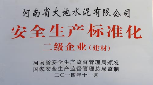 亚搏(中国) >> 走进大地 >>资质荣誉 >> 河南省大地水泥有限公司荣获安全生产标准化二级企业