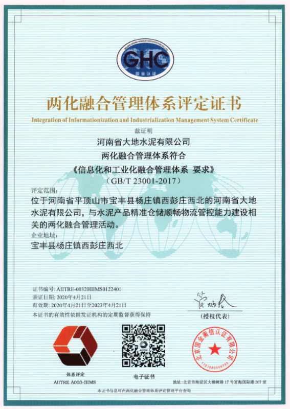 亚搏(中国) >> 走进大地 >>资质荣誉 >> 河南省大地水泥有限公司通过两化融合管理体系认证