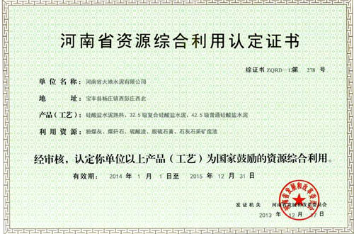 亚搏(中国) >> 走进大地 >>资质荣誉 >> 河南省资源综合利用认定证书
